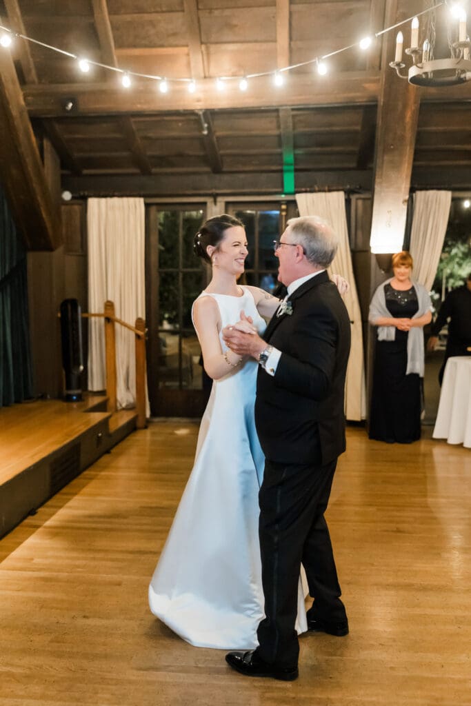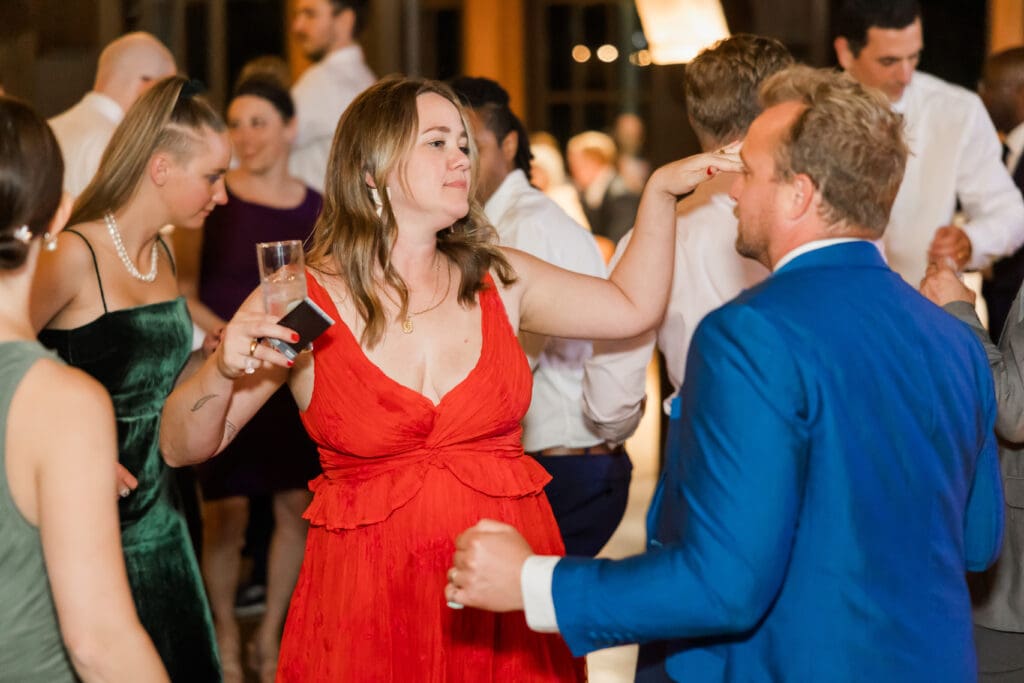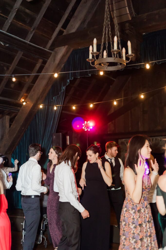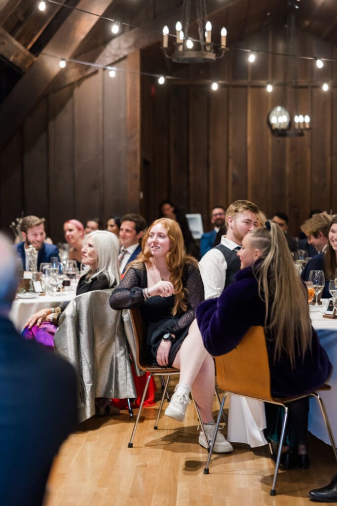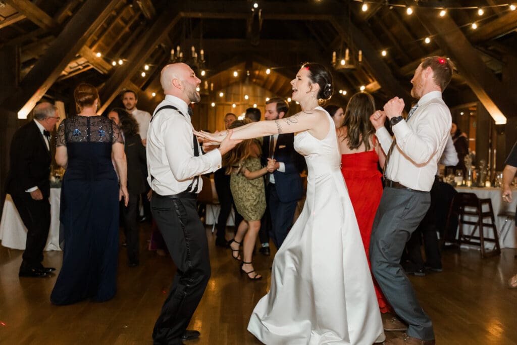 After the ceremony, guests move inside the clubhouse for the reception celebration. The reception hall features warm wood beams, hardwood floors, and soft lighting that creates an inviting and joyful atmosphere.