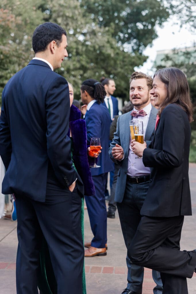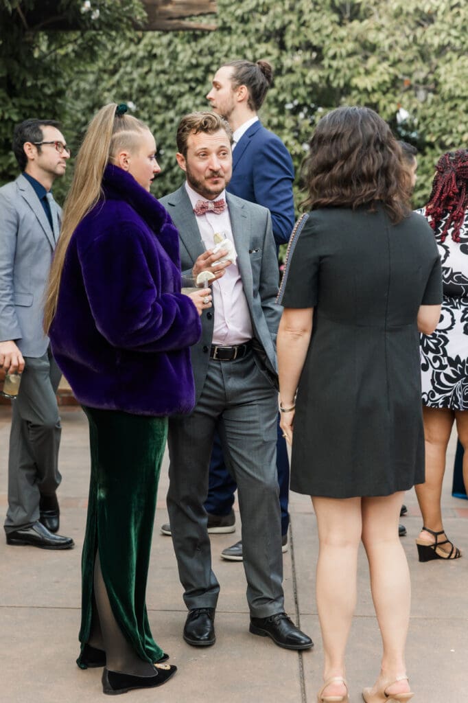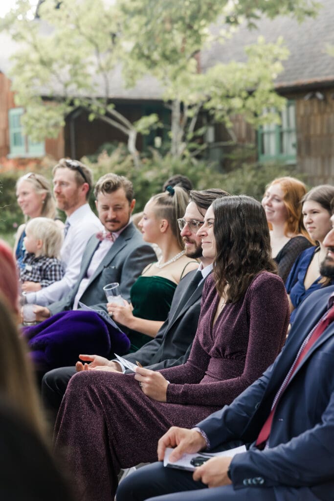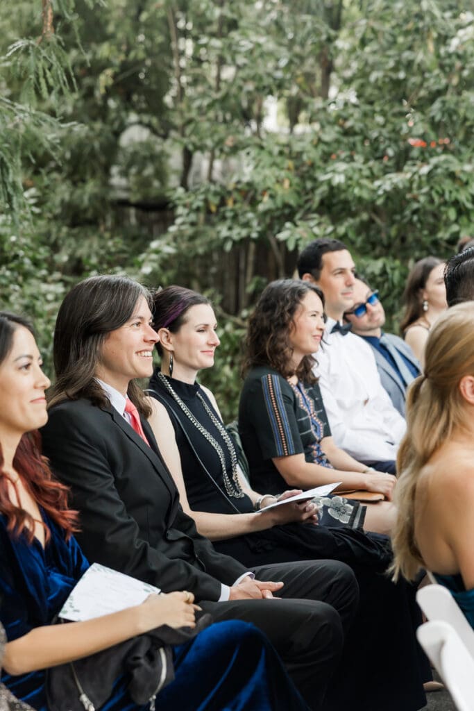 Guests gather in the shaded garden while sunlight filters through the leaves above, creating soft, natural light that is perfect for photography. The setting feels peaceful and intimate, allowing couples to stay present in the moment while celebrating with their closest friends and family.